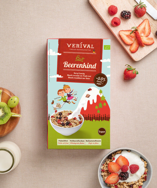 When the children crawl out of bed in the morning with a hunger for berries, Verival Berry Child is just the thing. The crunchy breakfast muesli and granola for breakfast consists of wholegrain oat flakes, freeze-dried raspberries, strawberries and blackberries.