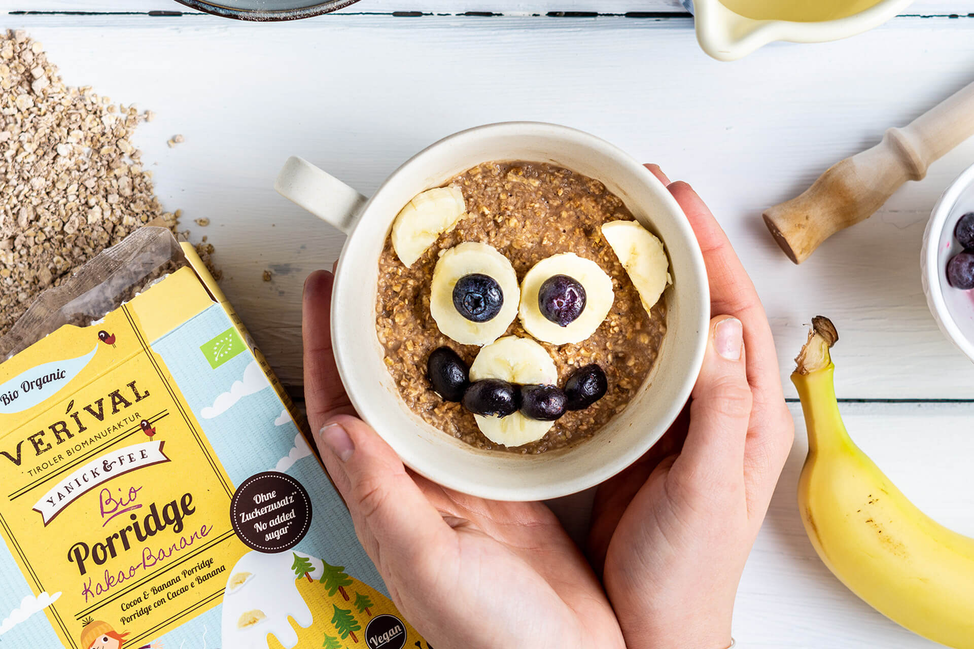 It is important for children to have a tasty yet healthy breakfast. The complex carbohydrates in oatmeal mean that children's blood sugar levels only rise slowly. In nutritional science, this is known as the low glycaemic index, and we completely avoid refined household sugar in our porridge and muesli for children. The natural sweetness in children's porridge is obtained from bananas and dates. So it not only tastes delicious, but is also child-friendly and above all healthy. On our website you will find simple recipes that you can easily recreate. It takes less than 15 minutes and you'll have a magical breakfast in front of you.